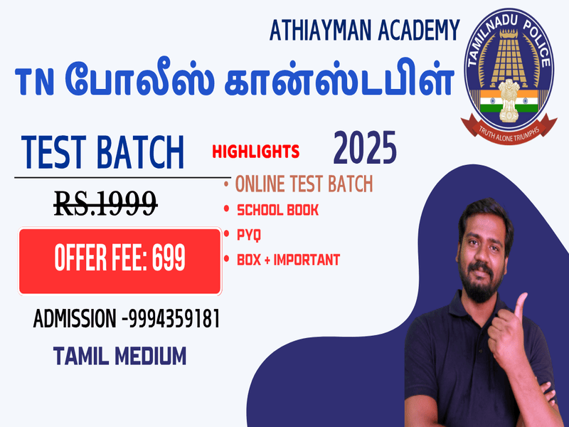 🛡️ POLICE WARRIOR – TEST BATCH 2025 🎯 இலக்கு: TNUSRB போலீஸ் கான்ஸ்டபிள் தேர்வு 2025 ________________________________________ 📦 இந்தக் கோர்ஸில் என்னென்ன உள்ளன? 1️⃣ 50+ தேர்வுகள் • தலைப்புவாரியான (Topic-wise) தேர்வுகள் • முழுத்தேர்வு (Full Test) – உண்மையான தேர்வு முறையில் 2️⃣ Book Back Answer PDF • சமச்சீர் பாட புத்தக கேள்வி–பதில்கள் • வேகமாக ரிவிஷன் செய்ய PDF வடிவில் 3️⃣ Notes & One Liner • தேர்வுக்கு முக்கியமான குறிப்பு (Notes) • ஒரு வரியில் நினைவில் கொள்ளும் தகவல்கள் (One Liner) 4️⃣ Box Content Test • ஒவ்வொரு அத்தியாயத்திற்கும் கேள்வி பெட்டி (Question Box) • Exam point of view கேள்விகள் மட்டும் தேர்வு செய்யப்பட்டது ________________________________________ ⚡ ஏன் இப்போதே சேர வேண்டும்? ✅ ஆரம்பத்திலேயே தொடங்கினால் – அதிக ரிவிஷன், அதிக நம்பிக்கை ✅ தேர்வு முன் கடைசி நிமிட அவசரத்தை தவிர்க்கலாம் ✅ தொடர்ச்சியான பயிற்சியால் போட்டியாளர்களை முந்தலாம்