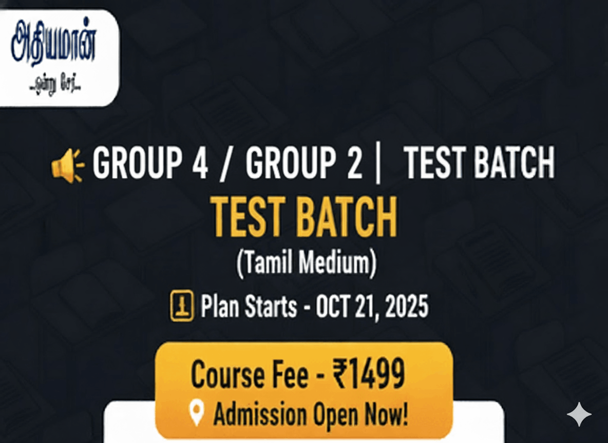 Group 4 – 2026 | Warrior Batch (தமிழ் Medium) 🚀 டிஎன்பிஎஸ்சி Group 4 – 2026 தேர்வுக்கான முழுமையான தயாரிப்பு (தமிழ் Medium) அதியமான் அகாடமி வழங்கும் திட்டமிட்ட Study Plan, , Online Tests – Group 4 தேர்வர்களுக்காக சிறப்பாக வடிவமைக்கப்பட்டுள்ளது. 📝 Unit-wise & Full-length Online Tests 📚 Covers Tamil General Studies + Aptitude + Current Affairs 🔑 Access via Athiyaman Academy Official App