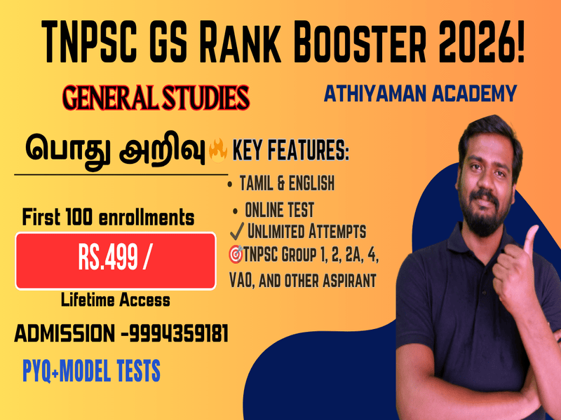 TNPSC General Studies Mega Test Series 2026 (PYQs + Model Tests for All Exams - Group 1/2/2A/4/VAO) 🔥 Course Features ✅ 10,000+ Practice Questions covering all GS topics ✅ Chapter-wise & Full-length Tests ✅ Unlimited Attempts ✅ Performance Analytics with All-Tamil Nadu Ranking ✅ Bilingual Interface (English/Tamil) ✅ Mobile-Friendly platform 📚 Syllabus Coverage Unit II: Geography of India (10Q Weightage) Location & Physical Features Monsoon/Climate/Water Resources Soil/Minerals/Natural Vegetation Social Geography & Tribes Disaster Management & Pollution Unit III: History & Indian National Movement (25Q) Indus Valley to Marathas Vijayanagar/Bahmani Kingdoms Freedom Struggle & Key Leaders Indian Culture & Unity in Diversity Current National Symbols/Personalities Unit IV: Indian Polity (40Q) Constitution & Preamble Fundamental Rights/Duties/DPSP Union/State/Local Governments Judiciary/Elections/RTI/Lokpal Recent Constitutional Amendments Unit V: Indian Economy & TN Development (50Q) Five-Year Plans & NITI Aayog RBI/Fiscal Policy/GST TN's Economy & Welfare Schemes Social Justice/Human Development e-Governance in TN Unit VI: TN History & Socio-Political Movements (40Q) Sangam Literature to Modern TN Thirukkural's Secular Values Justice Party/Dravidian Movement Periyar/Anna's Contributions TN's Role in Freedom Struggle
